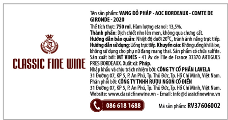 Comte De Gironde 2020 là loại rượu vang đỏ có hương vị trái cây, được pha trộn bởi giống nho Merlot và Cabernets. Đây là loại rượu vang dịu nhẹ và đầy hương vị thích hợp cho hầu hết các buổi họp mặt bạn bè