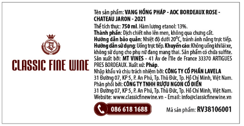 Được làm từ 2 giống nho Cabernet Franc và Cabernet Sauvignon, rượu vang hồng Château Jaron có màu hồng ngọc và hương vị sảng khoái, đầy sôi động của hương trái lý chua đỏ và dâu tây.