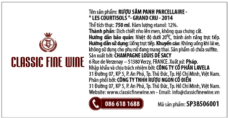 Champagne Les Courtisols được pha trộn bởi 75% nho Pinot Noir và 25% nho Chardonnay. Được trồng năm 1984 ở khu vực phía trên của sườn đồi và tiếp nhận ánh sáng của phía đông bắc. Tầng đất đá vôi. Thu hoạch năm 2014.