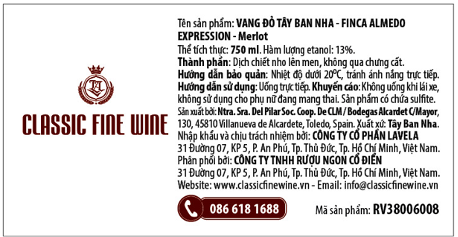 Được làm từ 100% giống nho Merlot, rượu vang đỏ Finca Almedo Expression có màu tím đậm đặc, hương quả mọng đỏ và những nốt hương phảng phất của cam thảo, bạc hà. Rượu có hương vị sang trọng và hấp dẫn với hậu vị kéo dài, tannin mềm mịn, hương vị của trái cây đậm màu.